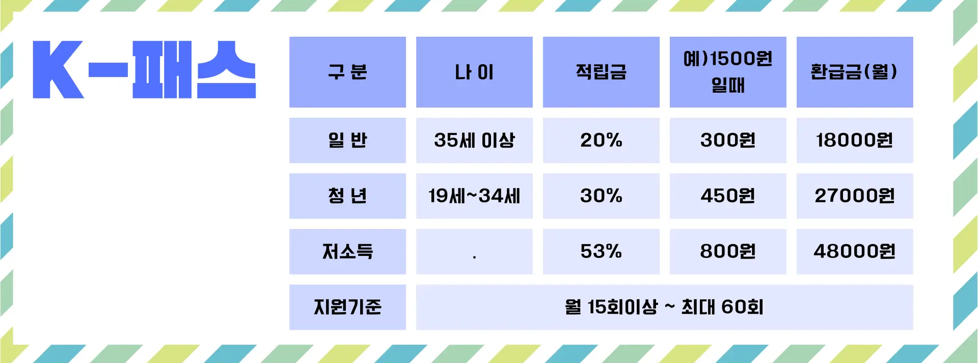 K패스는 월 15회 이상 정기적으로 대중교통을 이용할 경우 지출 금액의 일정 비율(일반인 20%, 청년층 30%, 저소득층 53%)을 다음 달에 환급받을 수 있는 교통카드입니다.